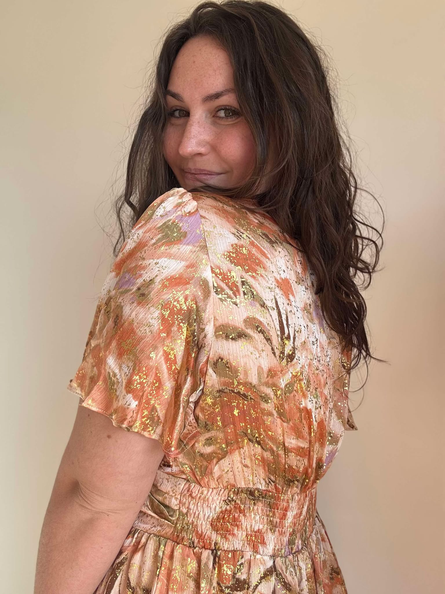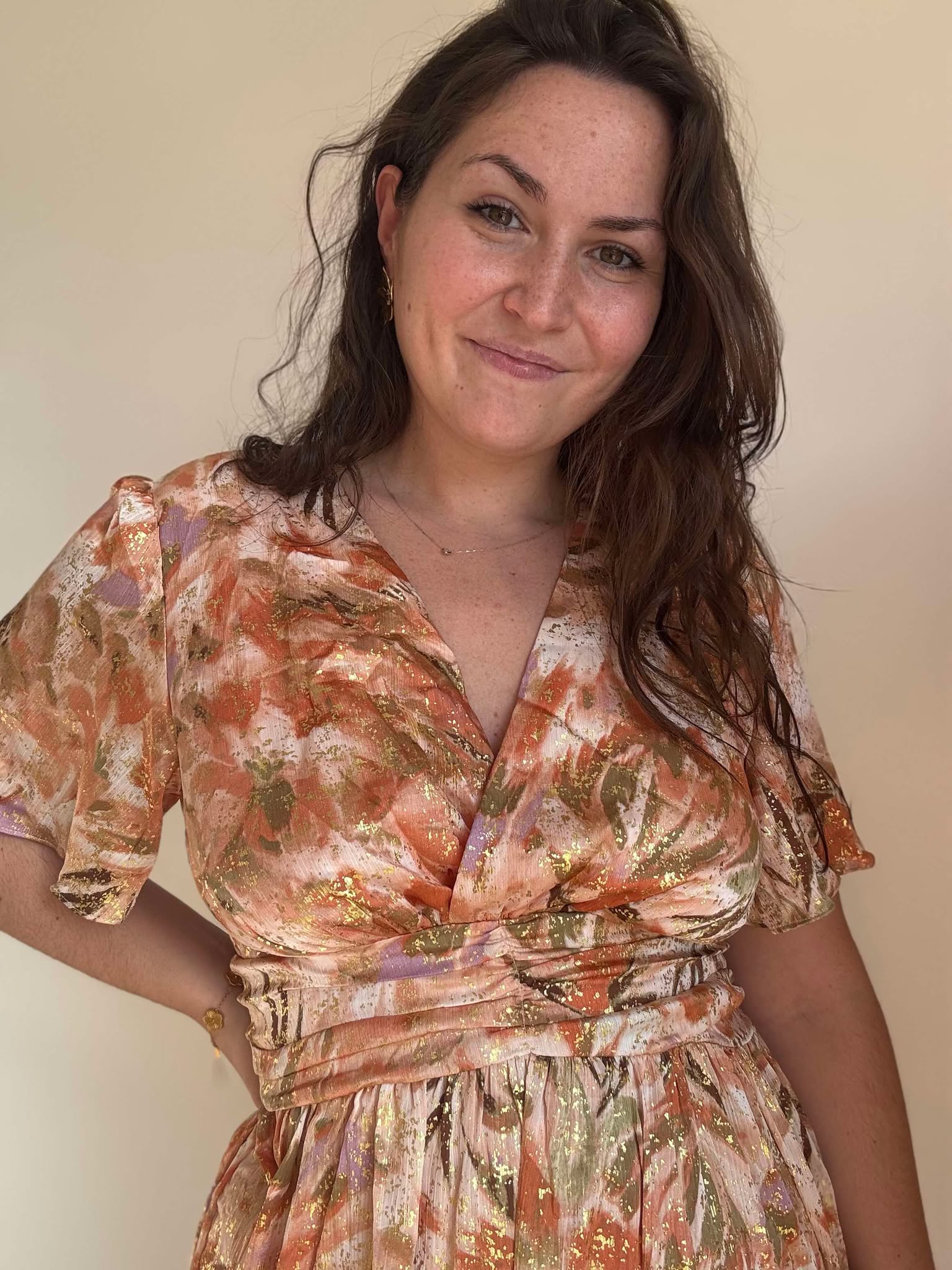 Cap sur le Sud avec cette robe longue au charme naturel. Son tissu léger, son imprimé au couleur du soleil avec ses reflets dorés et sa coupe flatteuse font d’elle une pièce idéale pour l’été. Le décolleté en V met subtilement en valeur, tandis que la taille smockée souligne joliment la taille sans serrer.