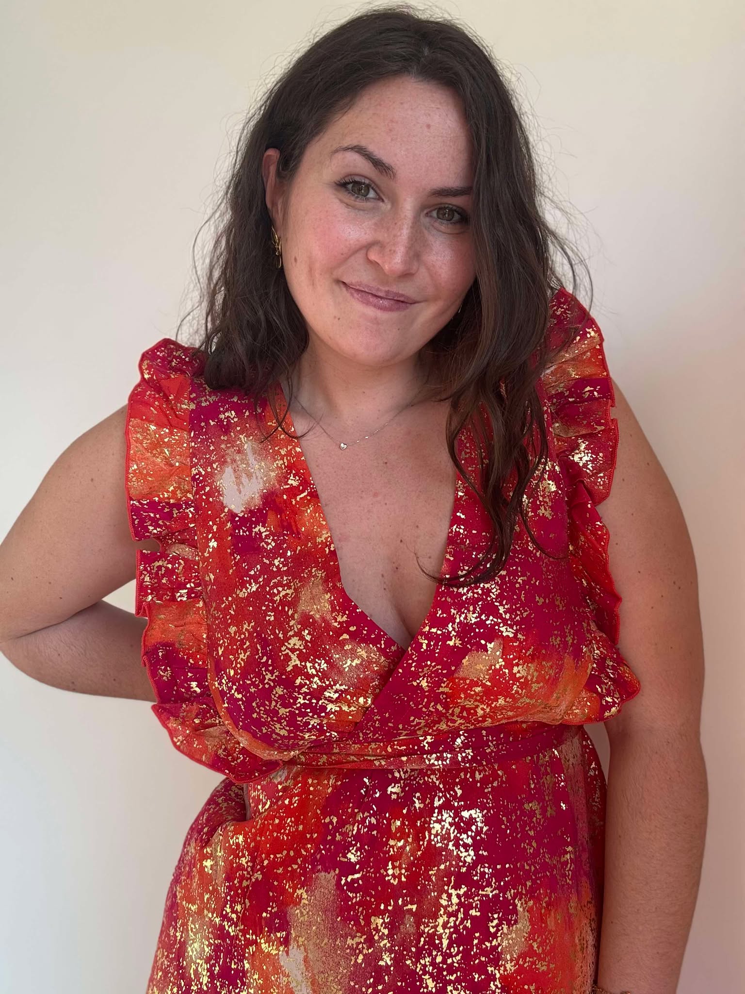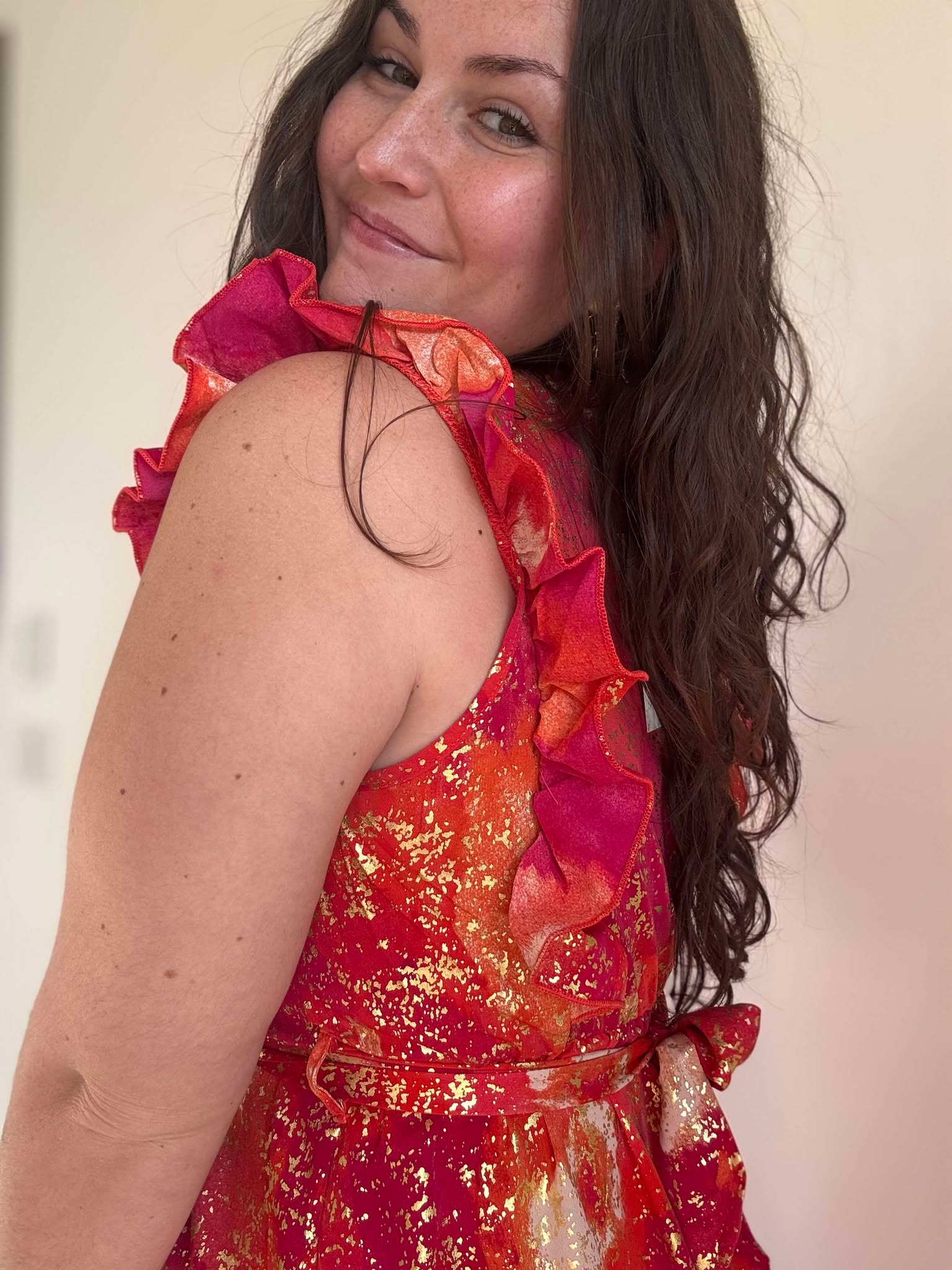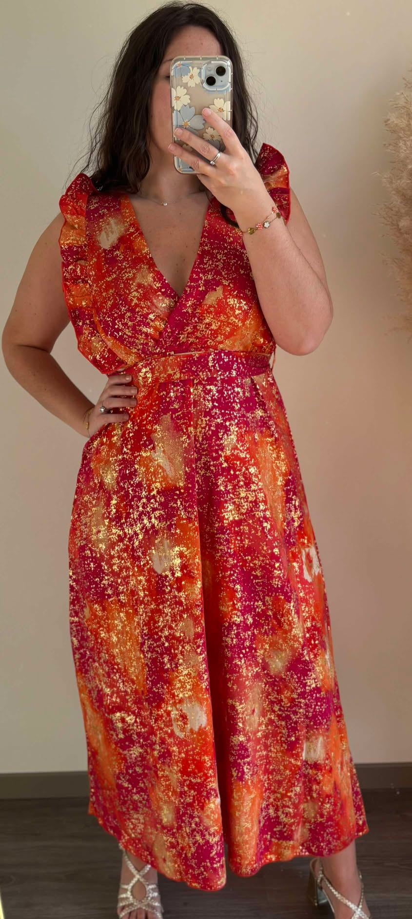 Laisse toi séduire par notre robe vibrante et féminine qui incarne parfaitement la chaleur et l’énergie des beaux jours. Son tissu fluide aux teintes flamboyantes de rouge, orange et doré crée un effet lumineux irrésistible.