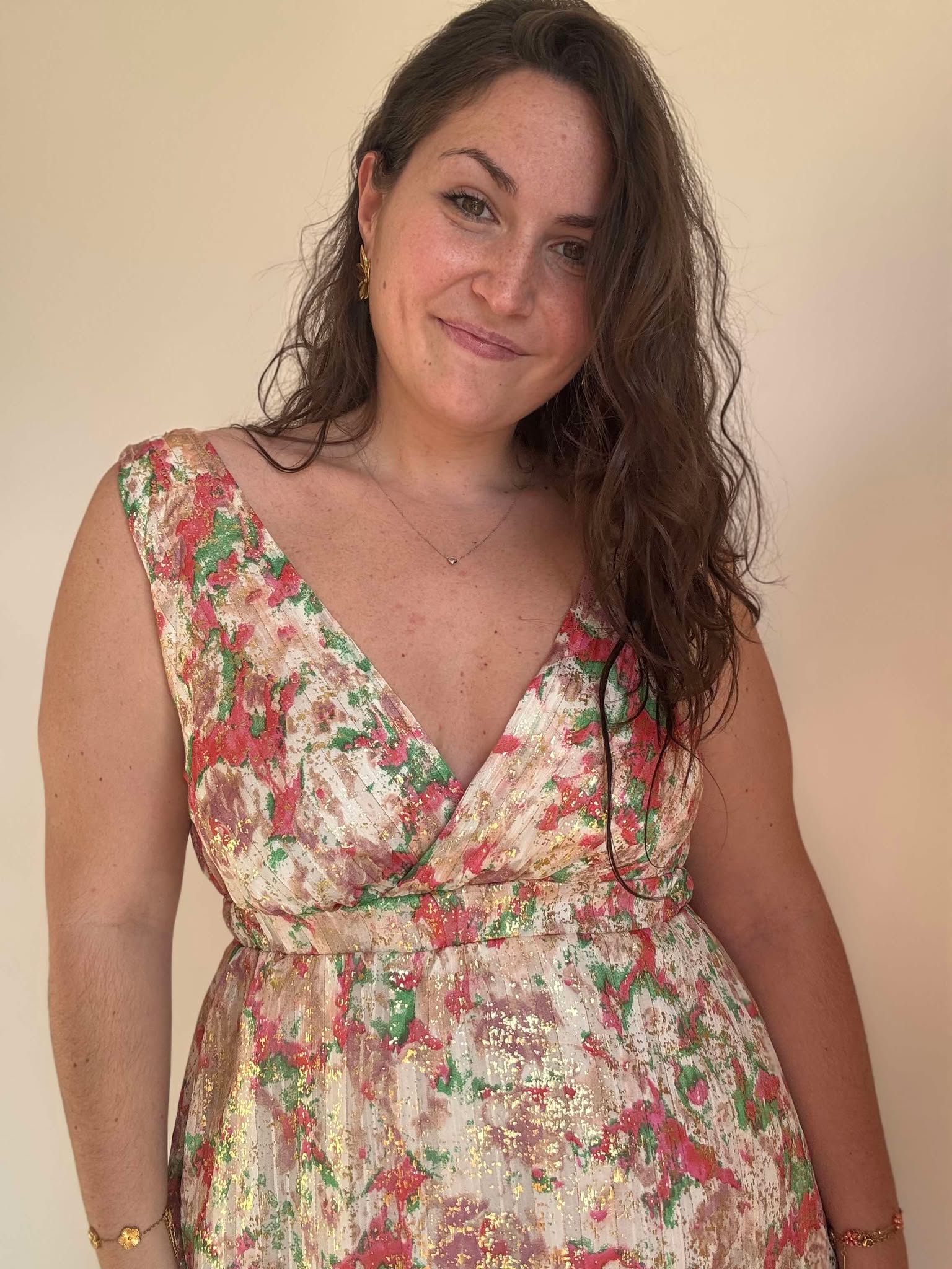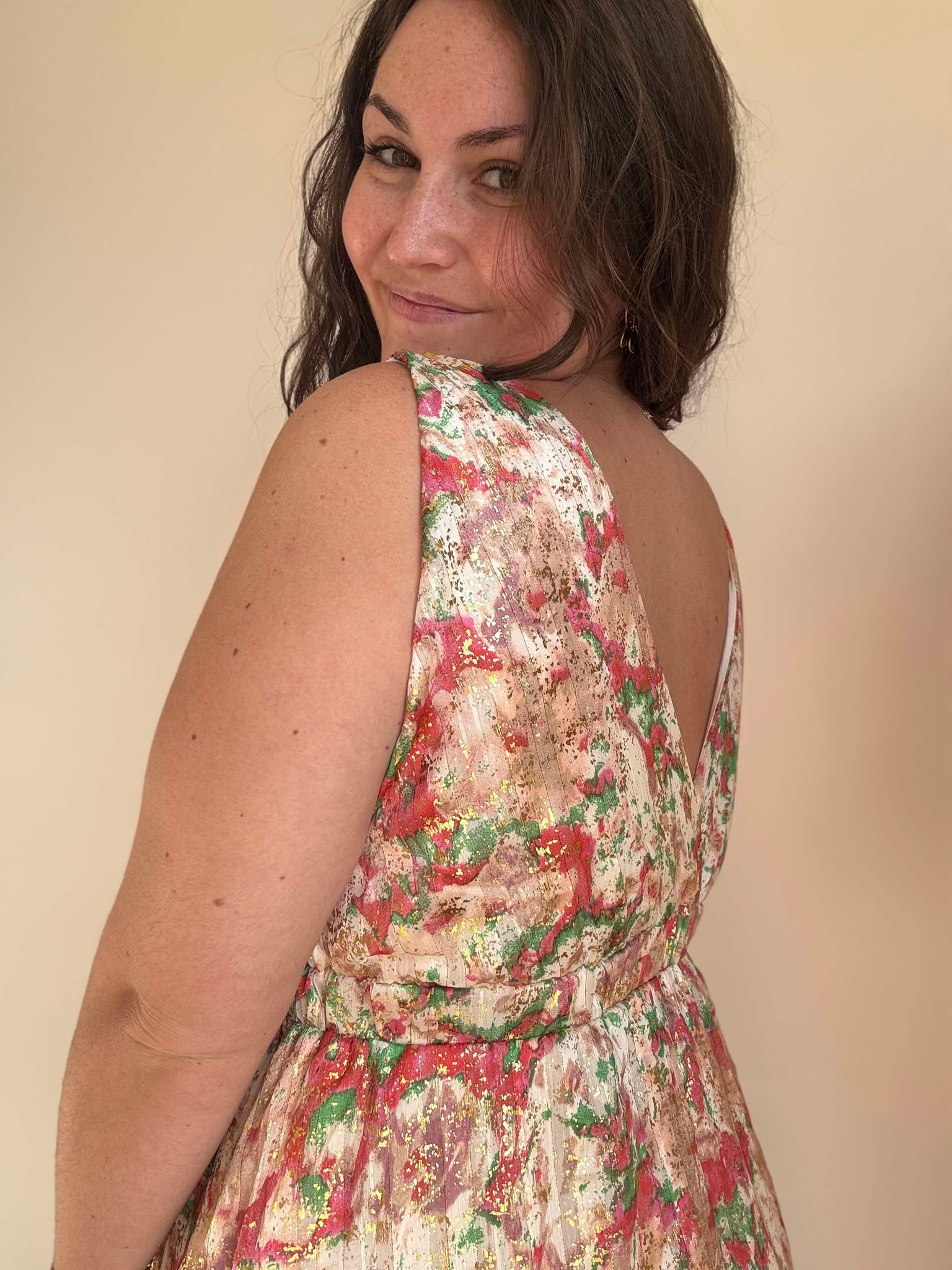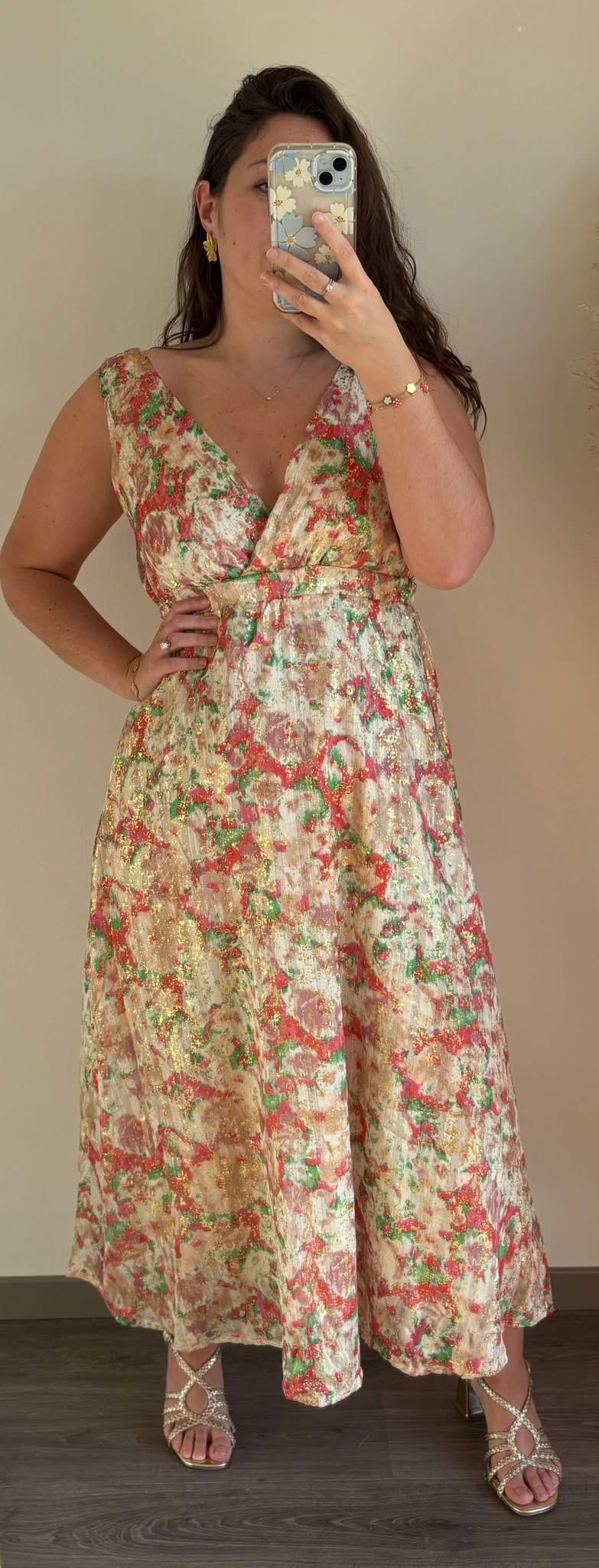 Plonge dans l’univers poétique de notre robe qui respire la fraîcheur, la féminité et la douceur estivale. Son tissu fluide aux nuances de crème, vert tendre, rose framboise et touches dorées crée un effet lumineux et subtil, parfait pour la saison.